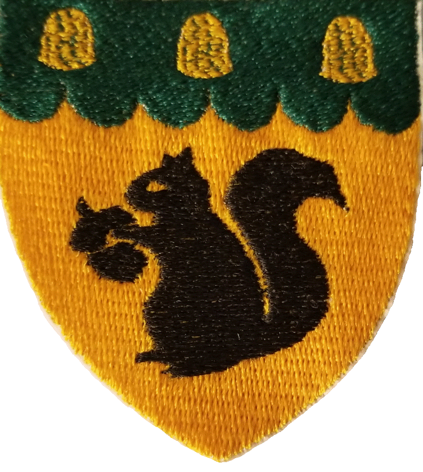 Or, a brown squirrel proper maintaining an acorn, on a chief invected vert three thimbles Or. Email: elspethm846 AT gmail DOT com