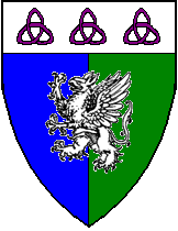 Per pale azure and vert, a griffin segreant contourny and on a chief argent three triquetras